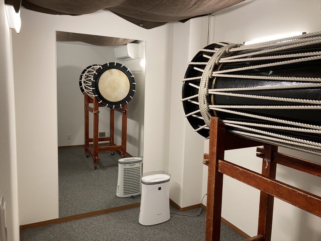 2尺8寸の大太鼓1台、1尺4寸~5寸の宮太鼓15台、締め太鼓4台を常設しております。